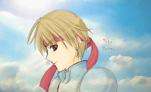 久々にクレスの気分だったので書いてみたけど、横顔は難しいな・・・。てかやっぱり男の顔が定まらないのですが?途中でめんどくさくなって、空の写真を借りてきてペタッって貼ったら、死んでお空に消えた人みたいになって反省w
